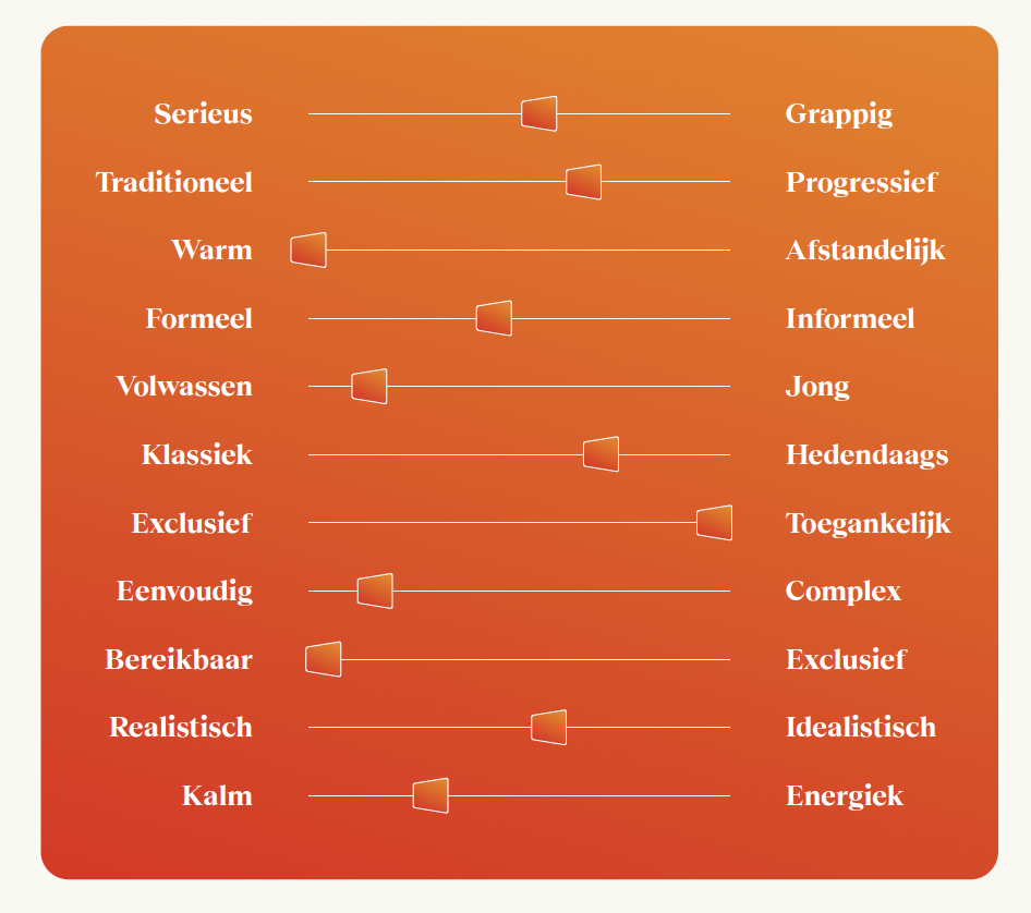 Wat voor persoon is dit merk, en hoe vertaalt zich dat in taal? Dat vatten we in een handvol principes, goed gestoffeerd zodat iedreen snapt hoe dit merk denkt, handelt en dus klinkt.