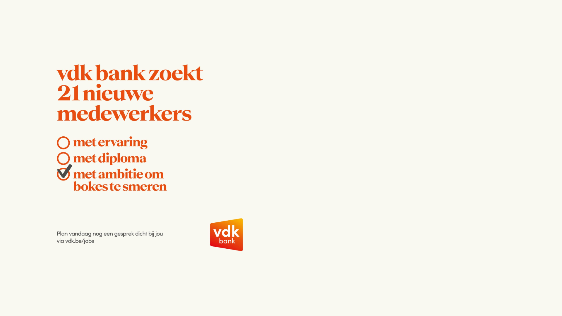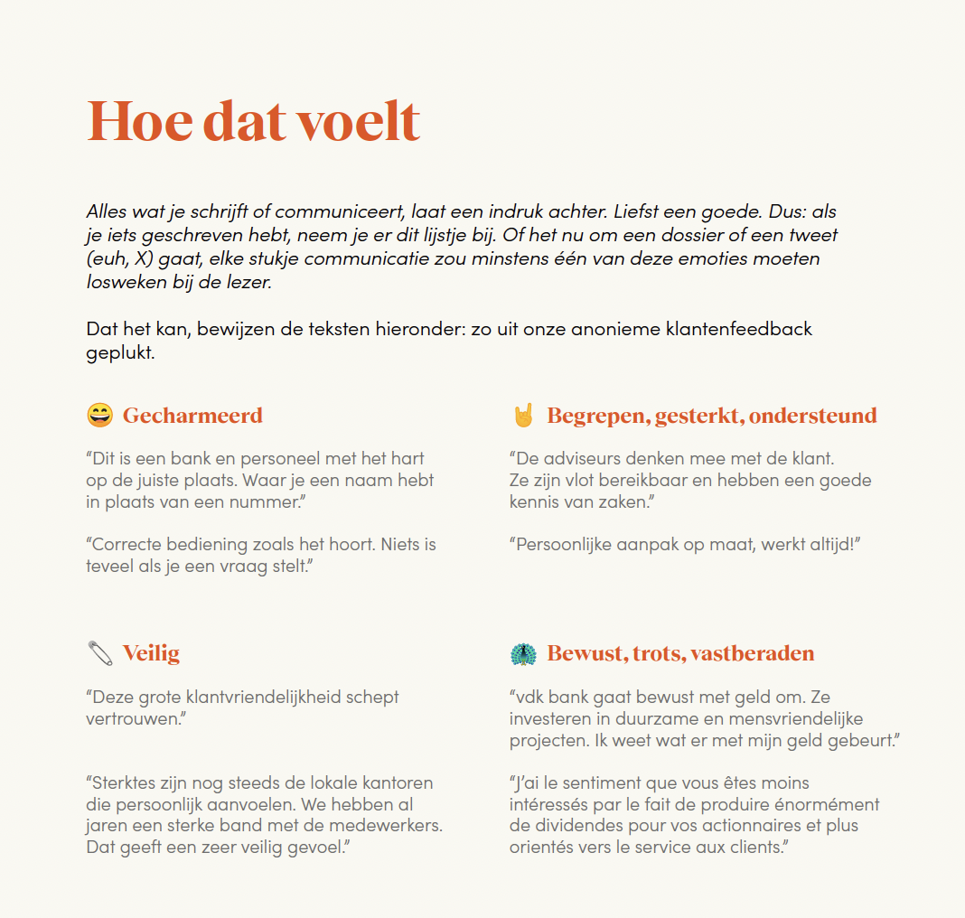Stel: ge zijt een bank. Maar ge wilt vooral niet al te bankig overkomen. Geen ivoren torens, geen investeringen in pijpleidingen en wapenhandel. Een ànder soort bank: sympa, eerlijk, oprecht – maar ook correct en goed met cijfers. Dat is vdk bank, wat ons betreft de liefste bank ter wereld. Omdat de mix van professioneel (want ja: een bank) en joviaal niet simpel is, vroeg vdk bank aan ons om een tone of voice gids te schrijven.