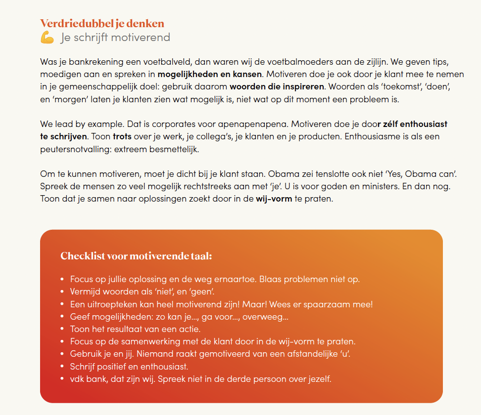 Tegenwoordig ligt in elk vdk bank kantoor een uitgewerkte tone of voice gids, om alle medewerkers te helpen snel de juiste woorden te vinden. Geprint en gedrukt, op echt papier. Met Tania op de cover. Een schoner compliment kunt ge ons niet geven.